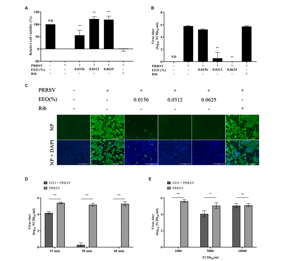 图1.桉树精油与PRRSV共处理,(A)细胞存活率检测,(B)病毒滴度检测,(C) IFA 处理组和未处理组的IFA。药物对照组使用利巴韦林。(D) (E)桉树精油与不同TCID50 PRRSV 的共处理效果。