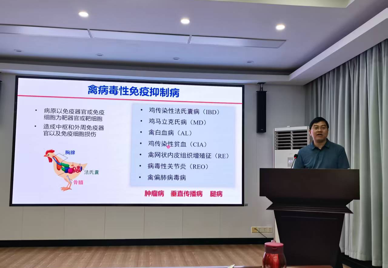 会上,高玉龙分享了题为“禽免疫抑制病防控技术研究”的学术报告,以法氏囊、马立克、禽白血病为主线,详细阐述了如何从疾病本身出发聚焦到发病机制研究的过程,强调要重视从生产实践中进行科学问题凝练,突出围绕防控产品来做基础研究的路线,介绍了团队在不断突破新型疫苗设计理念、锚定转化大型生产企业持续升级防控产品、建成免疫抑制病诊断、疫苗等防控产品体系方面取得的重要成果。