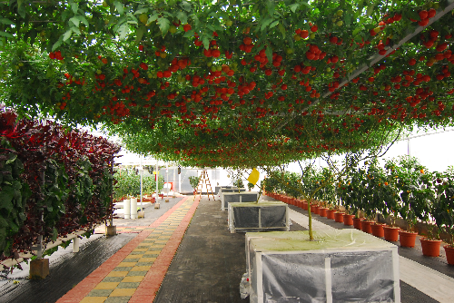 以增加植株冠幅面积、单株产量和延长生长结果周期为目标,采用多杆整枝方法及合理的环境、营养调控手段对具有无限生长特性的直立或蔓生草本蔬菜进行树型化或巨型化培育,设施栽培的番茄树、甘薯树、冬瓜树、茄子树和辣椒树等具有较强观赏性,适用于农旅观光和科普展示。