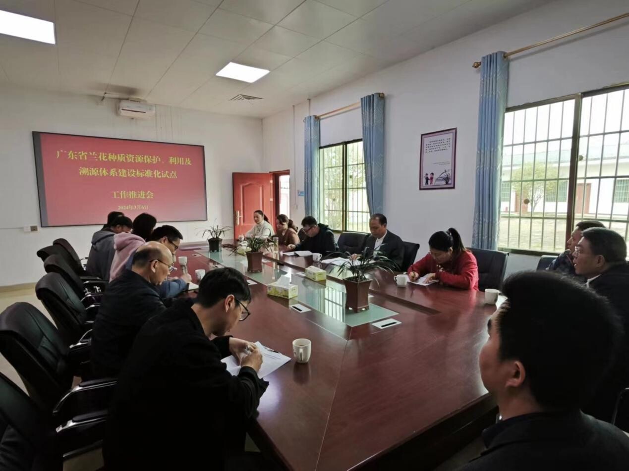 在广东省(韶关)粤台农业合作试验区翁源核心区,调研团队与粤台管委会、广东翁山兰花研究有限公司、翁源县德芳兰园有限公司、万艺信息科技有限公司等多家兰花企业代表召开了广东省兰花种质资源保护、利用及溯源体系建设标准化试点工作推进会。杨凤玺就翁源兰花产业标准化提出全产业链7个标准制定,并就标准制定细则进行了讨论与商定,讨论了产品信息的溯源工作兰花产业发展的重要性。最后,多家企业就兰花产业标准化种植中所遇到的难题进行了多方面的探讨。