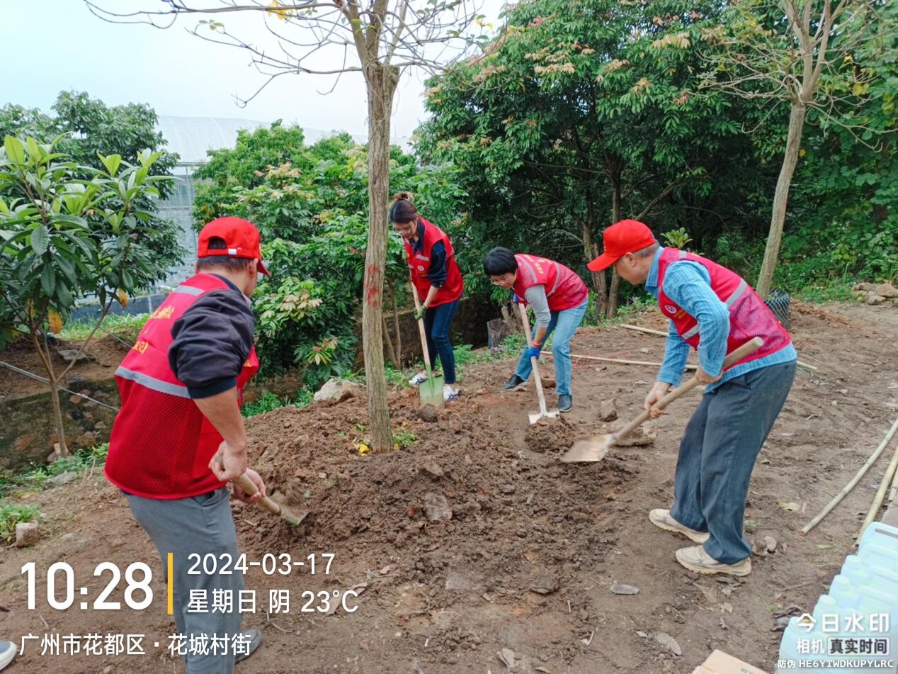 3月17日,环艺所所长朱根发、党总支书记陈普照带队参加花都区花山镇花城村绿美广东示范村建设项目(一期)植树活动。院团委书记马静、院志愿服务队队长汪敏与环艺所志愿者组成省农科院先锋队共同参加活动。