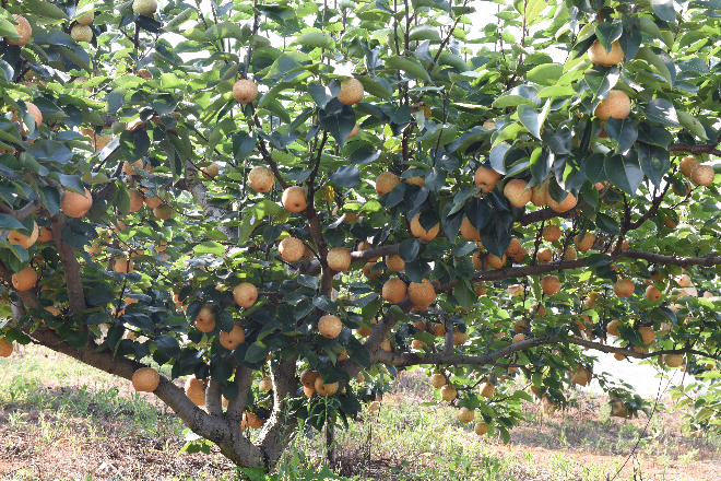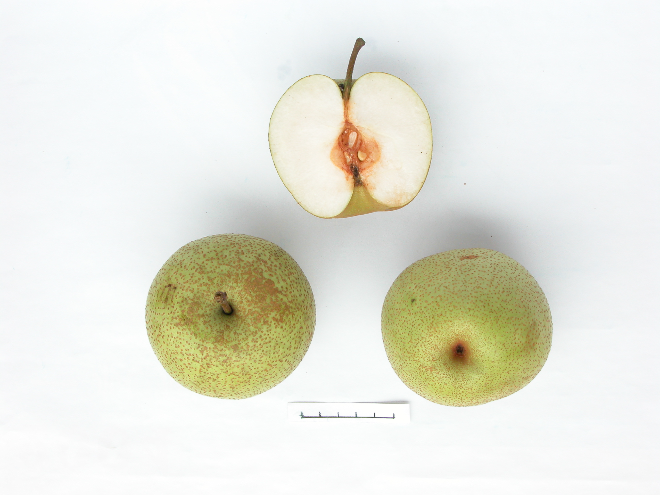 品种优势:果实近球形,果面光滑,果点稍大,果皮青绿色,成熟时转黄绿色,套袋后果面呈亮黄色,着色均匀。平均单果重253g,果心偏小。果肉乳白色,肉质细嫩,石细胞少,汁液多,可溶性固形物含量12.1%,口感清甜脆嫩,有蜜香味,品质优良。