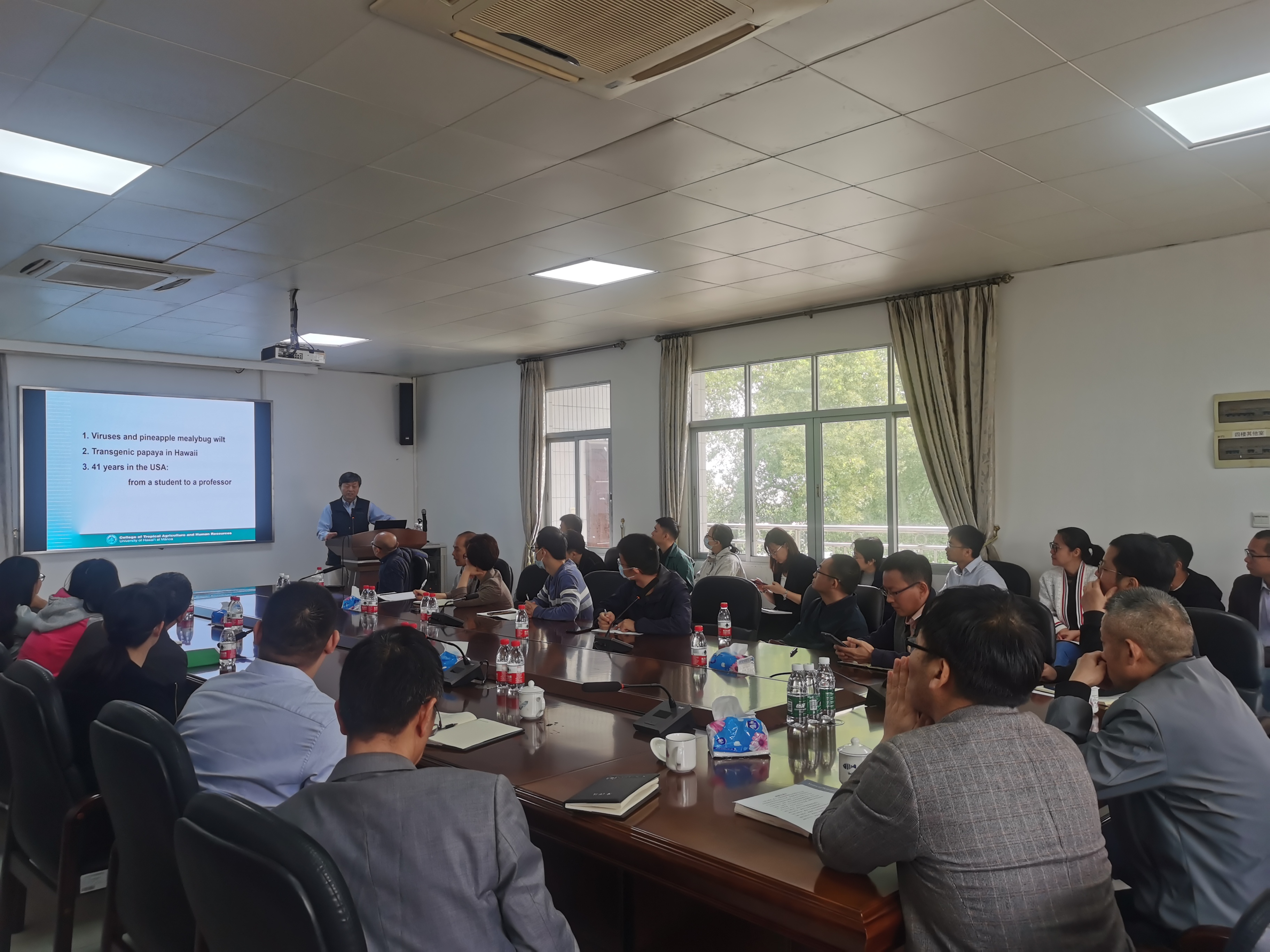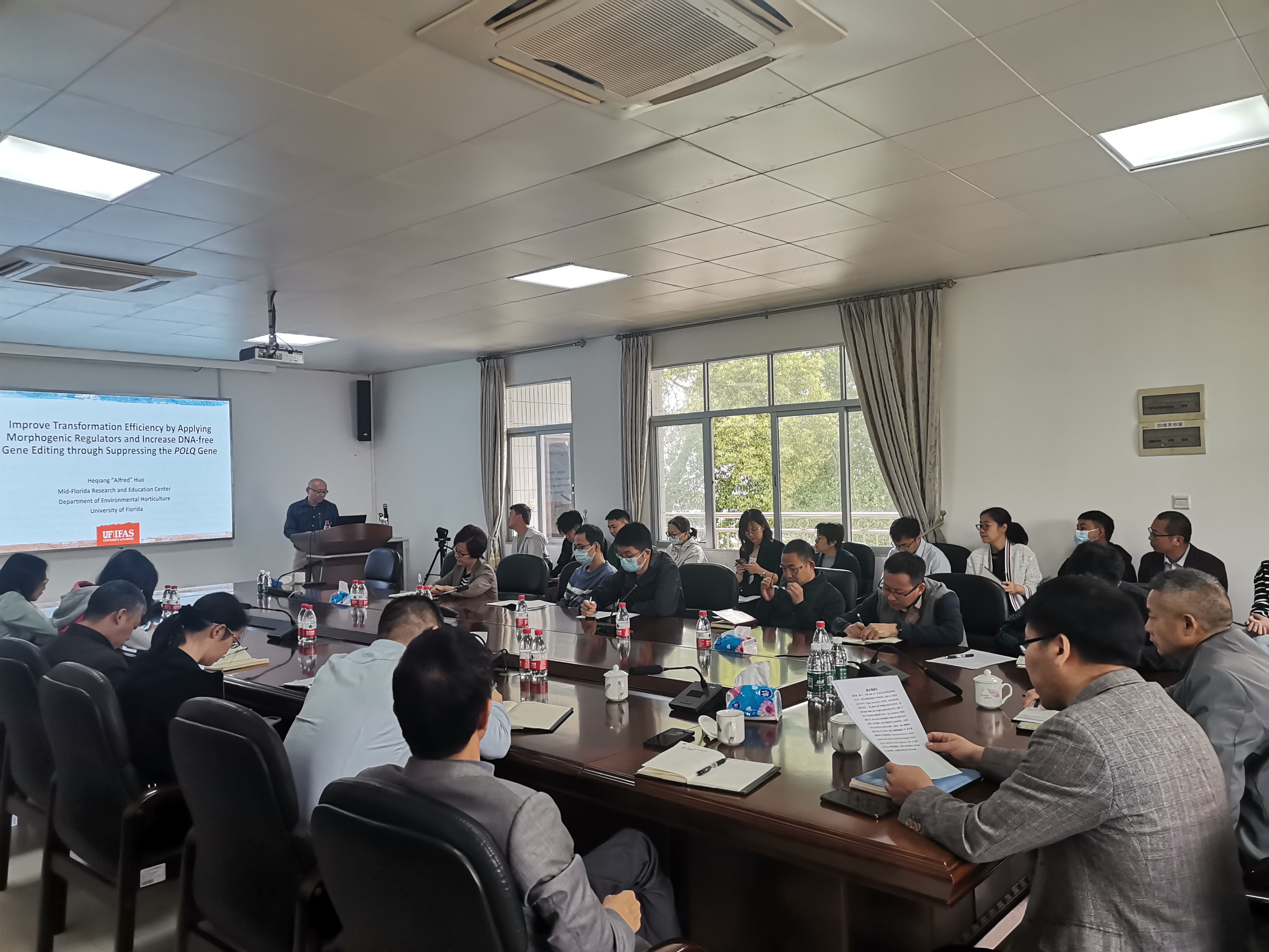 会上,霍合强助理教授以“利用形态发生调节因子提高转化效率,通过抑制POLQ基因增加无DNA基因编辑”和“暗致叶类蔬菜叶片退化的调控”为题,详细介绍了通过农杆菌体外注射成株或者侵染外植体离体再生的方法及科研思路。胡晋生教授以“中国植物病毒学家在美国40年的工作经验”为题,就菠萝、番木瓜等热带亚热带水果主要病毒的分离、鉴定、基因组序列差异等进行了详细介绍,并分享了自己在工作和生活上的心得体会。与会人员认真聆听报告,并与两位专家进行了深入交流。