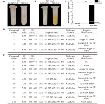 龙眼是药食兼用型水果,深受人们喜爱,然而其果实在采后贮藏过程中果皮迅速褐变,严重影响其商品价值。已有研究表明,龙眼果皮的褐变与果皮中原花青素和木质素的氧化聚合有着密切的关系。该研究从龙眼果皮中分离纯化得到一个高纯度的过氧化物酶PRX53-2,该酶在体外对表儿茶素/儿茶素(原花青素单体)和松柏醇(木质素单体)的氧化聚合反应具有很强的催化作用,并且能够形成导致龙眼果皮褐变的褐色产物。该研究成果有助于人们深入理解植物组织褐变过程,并为其他果蔬的褐变研究提供参考。