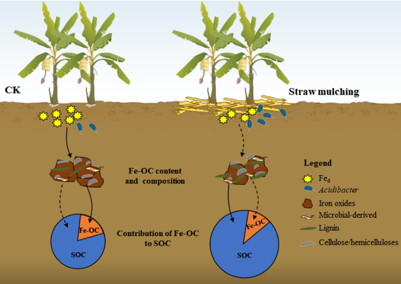 土壤有机碳(SOC)是陆地生态系统最大的碳库,有效提升农田SOC储量与促进其长期稳定成为当前面临的重大科学问题与技术挑战。铁氧化物对有机碳的固持是SOC稳定和累积的重要机制,秸秆还田是农田“养地固碳”的有效途径之一。香蕉秸秆体积大、含水量高且不易搬运,通常就地覆盖还田。为了深入探讨秸秆覆盖对土壤铁结合态有机碳(Fe-OC)的影响,团队在香蕉园进行了为期2年的秸秆覆盖还田试验。研究结果表明,秸秆覆盖显著提高了SOC含量(+34.02%),土壤Fe-OC约占SOC的12.24%-25.34%。与对照处理相比,秸秆覆盖显著降低了土壤中Fe-OC含量及其对有机碳的贡献,这可能与土壤游离态氧化铁含量、Acidibacter丰度和α-葡萄糖苷酶活性有关。基于同步辐射红外显微成像光谱(SR-FTIR)分析表明,秸秆覆盖增加了纤维素/半纤维素与多肽的结合,且木质素、铁氧化物与多肽的相关性高于对照处理。以上结果表明,秸秆覆盖可能通过多种物理、化学和微生物机制降低土壤Fe-OC含量,这些Fe-OC可能以木质素和微生物衍生的有机化合物的形式保存在土壤中。研究成果有助于深入理解香蕉秸秆覆盖下Fe-OC库形成及其微生物驱动机制,可为香蕉秸秆的可持续管理提供决策参考。