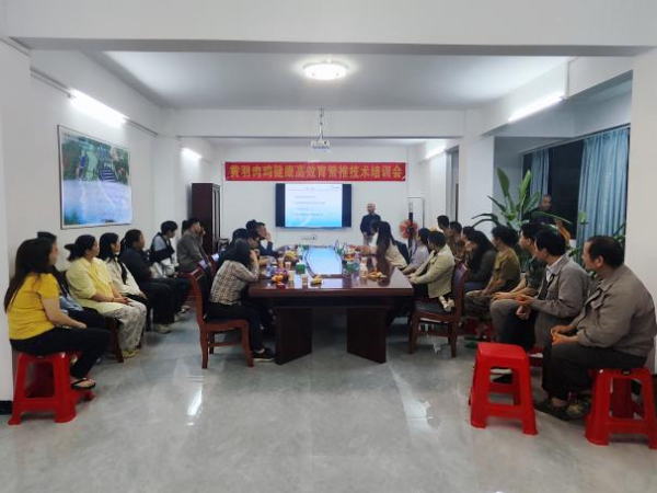 33日,广州市科技特派员、动科所副研究员李莹、正高级畜牧师徐斌,联合封开县智诚家禽育种有限公司董事长曾华、安徽瑞格电子科技有限公司技术高管张永杰等,赴广州市三三禽业有限公司举办“黄羽肉鸡健康高效育繁推技术培训会”。三三禽业董事长董晓菊、总经理邢广亚及50余名从业人员参加培训。