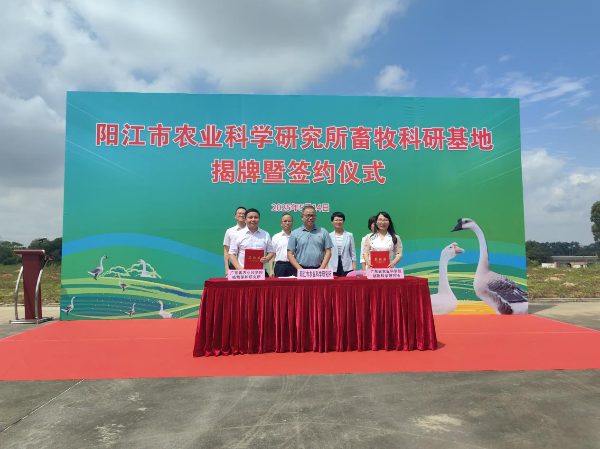 调研结束后,团队出席阳江市农业科学研究所畜牧科研基地揭牌签约仪式共同为“阳江市农业科学研究所畜牧科研基地”及“亚洲足球体育博彩平台 动物科学研究所科技成果示范基地”揭牌。动科所、植保所与阳江市农科所现场签订科研合作协议,双方将围绕阳春白鹅、阳江黄鬃鹅、鳜鱼等特色品种的资源保护、选育繁推、健康养殖等开展深度合作,为阳江农业高质量发展注入科技动能。