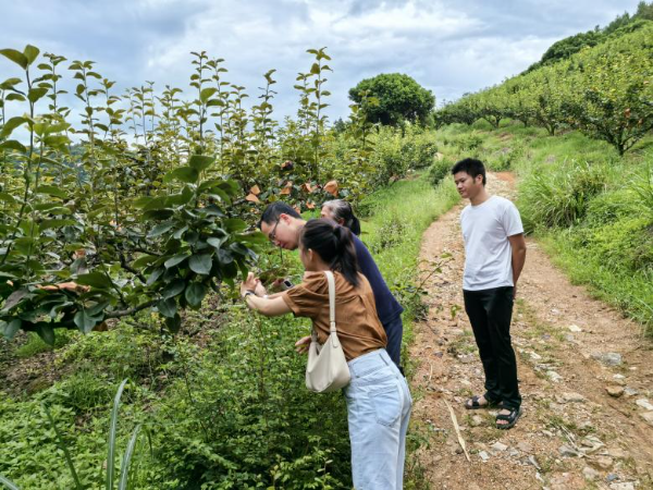 在松柏村甘竹坪村,特派员重点聚焦当前水晶梨面临的高温高湿季节性病虫害问题,深入果园实地勘察,采集病叶样本,进行诊断。随后为农户提供了一套绿色防控的解决方案,保障水晶梨品质安全与产量稳定。