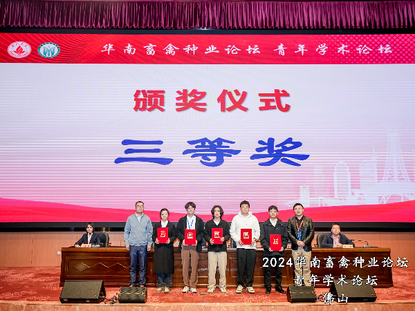 此次盛会中,动科所所长罗成龙研究员、家禽育种与生产研究室主任计坚研究员率领团队科技人员和研究生近30人积极参与,展现了动科所在畜禽种业领域的深厚底蕴。罗成龙作为广东省畜牧兽医学会畜禽遗传育种分会理事长在大会上做致辞。动科所选派的两名联合培养研究生贾少炎、赵浩毅荣获了论坛的三等奖。