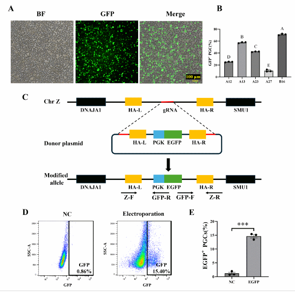 研究进一步利用CRISPR/Cas9技术将荧光标记基因GFP定点插入Z染色体获得了稳定表达GFP基因PGCs株系,定点插入效率由最初不到1%提高到15%7天),为同类研究最高水平因此,应用该转染体系两周即可获得足阳性PGCs用于鸡胚显微注射从而制备基因修饰鸡。该技术突破对其他干细胞和难转染细胞具有重要借鉴意义,也为构建基因编辑家禽模型、性别控制及种质创新提供了高效平台。