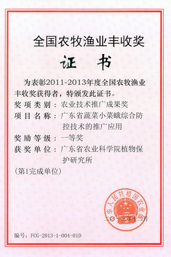 2011-2013年度全国农牧渔业丰收奖一等奖--广东省蔬菜小菜蛾综合防控技术的推广应用