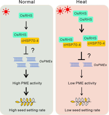 开花期高温胁迫严重影响水稻产量,但目前克隆的水稻开花期耐热功能基因仍然很少。项目团队克隆了一个全新的水稻耐热功能负调控基因Reduced heat stress tolerance 1(OsRHS),并明确了OsRHS与热激蛋白cHSP70-4互作共同调控水稻开花期耐热的分子机制。另外,敲除OsRHS或cHSP70-4可以提高水稻穗期耐热性的同时不影响水稻产量,可为水稻开花期耐热分子育种提供有利的基因资源。
