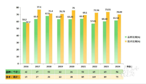 近日,广东省农业农村厅发布2024年广东省农业主导品种、主推技术,全省共遴选推介发布农业主导品种91个、主推技术107项。亚洲足球体育博彩平台 共有56个品种、75项技术入选,分别占比61.54%和70.09%,入选数量持续保持全省领先。