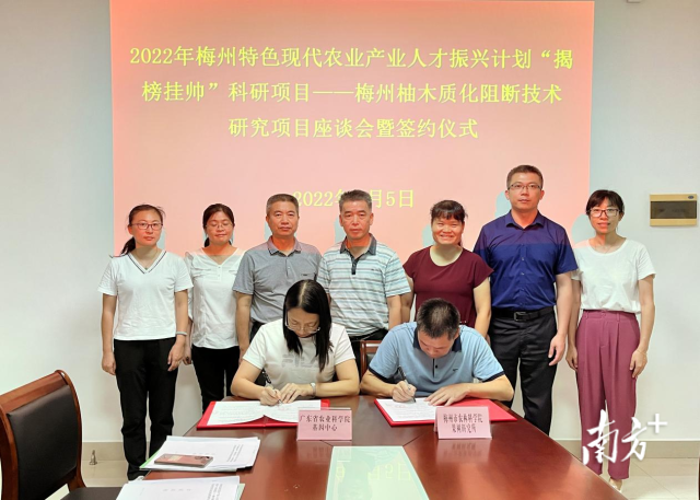 近日,梅州柚木质化阻断技术研究项目座谈会暨签约仪式在市农林科学院果树研究所举行。省农业科学院农业生物基因研究中心副主任晏石娟,市农林科学院副院长谢岳昌、市农林科学院果树研究所所长李国华,以及相关科技人员参加了座谈会。