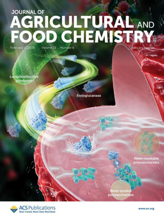 近日,加工所功能食品创新团队在食品领域顶级期刊Journal of Agricultural and Food Chemistry(中科院农林科学一区TOP,IF=5.7)发表了题为“Accumulation of Water-Soluble Polysaccharides during Lychee Pulp Fermentation with Lactiplantibacillus plantarum Involves Endoglucanase Expression”的封面论文。加工所为论文第一完成单位,加工所联培博士研究生黄桂涛为论文第一作者,张名位研究员和黄菲研究员为论文共同通讯作者。