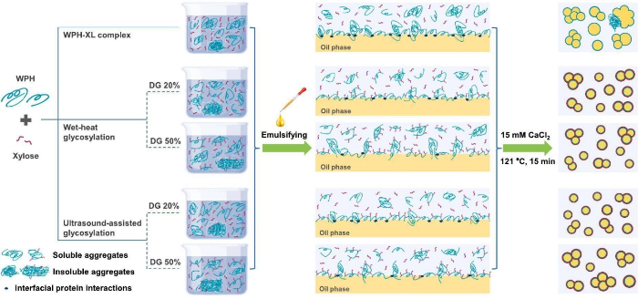 超声辅助糖基化可调控蛋白钙耐受能力和乳液褐变程度。因此,本研究进一步探讨了超声处理对WPH-XL交联物的结构、性质及其O/W乳液稳定性的影响。结果表明,相比于对照组,超声辅助糖基化可显著提高3-5倍反应速率,并抑制AGEs形成,其中,20%糖化度的超声辅助WPH-XL交联物表现出最好的加工性能,可有效抵抗121°C、15 mM Ca2+的热杀菌处理。这种改善作用在于超声辅助糖基化可促使交联物中的大聚集体解离为小聚集体,从而增强其界面吸附能力、界面相互作用和界面强度等特性。本研究从界面行为角度揭示了超声辅助糖基化对WPH营养乳液稳定性的影响机制,为钙热稳定型WPH基料的开发提供了重要的技术指导。