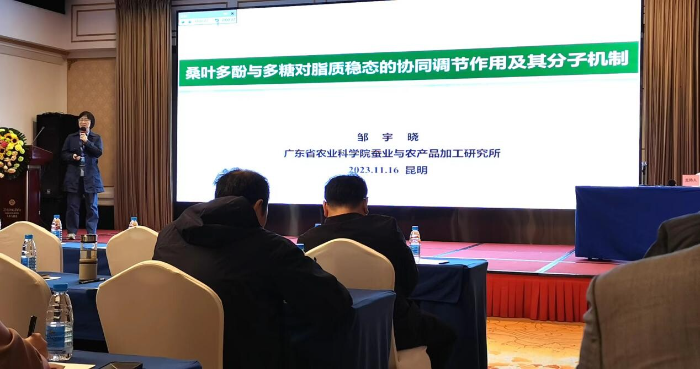 会上,邹宇晓研究员以“桑叶多酚多糖协调调节脂质代谢及其分子机制”为题作做大会报告,介绍了蚕桑南药与微生物资源加工利用团队在桑叶多酚多糖协调调节脂质代谢作用机制方面的最新研究成果,展示了桑叶多酚多糖巨大的应用潜力和市场价值。加工所王丹博士作“基于GWAS技术的桑树重要农艺性状调控基因挖掘及鉴定”报告,介绍了桑树育种团队在桑树全基因组测序工作方面取得的最新研究成果。