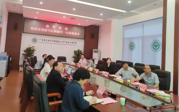 近日,化州市委副书记傅捷丹、农业农村局总农艺师刘积超和广东博富汇农业发展有限公司总经理陈武等一行7人到加工所交流。广东省人大农村农业委副主任廖森泰、加工所所长徐玉娟、副所长邹宇晓及相关科研骨干参加座谈。