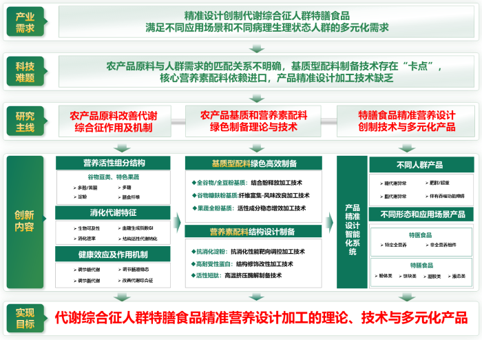 项目针对代谢综合征人群特膳食品精准设计创制面临专用农产品原料与人群营养需求的匹配关系与健康效应机制不明确,专用核心基料和营养素配料不足、制备技术存在“卡点”,产品精准营养设计加工技术缺乏,且无法满足不同人群和不同应用场景的多元化需求等科技难题,历时14年,创建代谢综合征人群特膳食品精准设计创制的基础理论与关键技术。系统解析了特色全谷物和果蔬中多酚/黄酮、多糖、膳食纤维、抗消化淀粉等营养活性组分的结构及消化代谢特征,阐明各组分及其协同改善糖脂代谢、调节肠道功能稳态等健康效应,并揭示其分子机制,明确农产品原料与代谢综合征人群营养需求的匹配性关系,为特膳食品加工原料选配及产品设计提供了理论基础;发明了代谢综合征人群特膳食品专用的全谷物/全豆粉、谷物糠麸粉、果蔬全粉等农产品基质型配料和抗消化淀粉、高耐受性蛋白等营养素配料绿色高效制备关键技术与核心装备,解决了农产品基质型配料品质易劣变、食味差、功能特性不突出,核心营养素配料长期依赖进口等“卡点”问题;创建了农产品基质型代谢综合征人群特膳食品精准营养设计智能化系统,突破营养代餐粉、代餐乳(浓浆)、代餐棒(饼/块)、代餐凝胶类不同形态特膳食品的精准加工关键技术,设计创制出多元化产品并实现产业化。