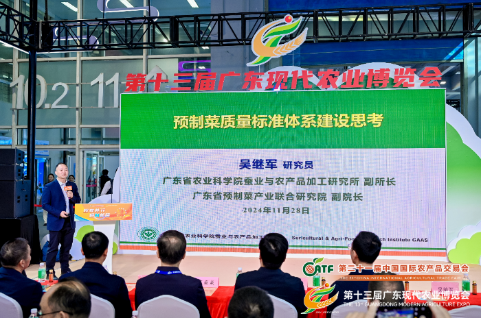 11月28日,由中国农业农村部主办的第二十一届国际农产品交易会在广州中国进出口商品交易会展馆召开,由广东省农业农村厅主办的第十三届广东现代农业博览会同期召开,在会议预制菜产业创新与发展交流活动中加工所副所长吴继军应邀作“预制菜标准体系建设思考”报告,吴继军介绍了预制菜标准体系建设的意义以及预制菜安全标准、营养健康标准和高品质标准体系建设思路。