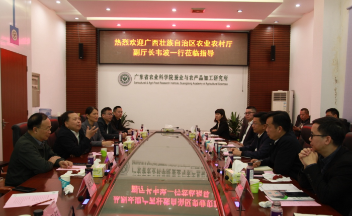 11月28日,广西壮族自治区农业农村厅副厅长、党组成员韦波、广西蚕业技术推广站站长卿军、广西绿色食品发展站站长莫建军等一行10人到加工所调研交流,省人大农村农业委副主任廖森泰、广东农科院副院长何秀古、加工所所长徐玉娟率相关科技骨干参加了座谈交流。