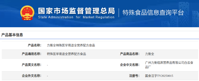 “力衡全”获国家特殊医学用途全营养配方食品注册批件