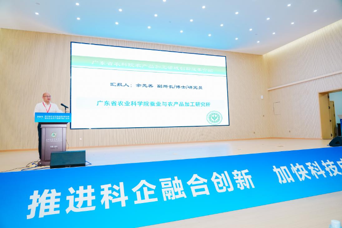 在成果分享环节,余元善作“广东省农科院农产品加工领域创新成果介绍”主题报告,系统阐述了加工所在热带亚热带农产品深加工领域的技术突破与产业化实践。活动现场,加工所设置的展示专区人气十足,100%HPP桑葚汁、桑葚干等蚕桑类、功能食品类展品集中亮相,其背后的规模化生产技术、全资源利用方案引发贵州企业广泛关注。